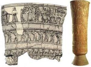 در نقوش سنگ يادبود شکار از وارکا، لباس شاهزادگان شامل دامن نيمهبلند بههمراه کمربند برجسته و بالاتنه برهنه است. همچنین کلاه یا سربند با نوار برجستهای به سر دارند که شبیه عرقچین است. نمونه دیگر از تجسمبخشی به لباس سومریان، یک ظرف مخصوص آیینی با چندین نوار تزیینی است که دستههای مذهبی و صفهای طولانی اهداکنندگان نذورات و حیوانات قربانی را نشان میدهد. در ردیف بالایی نوار تزیینیاش، مردی تجسم یافته که پارچهای با بافتی متفاوت و دو منگوله آویز در انتهایش را در دست دارد. باستانشناسان معتقدند چنین پارچهای با بافت متفاوت جزء هدایا و نذوراتی بوده که به الهه باروری تقدیم میشده است. روي يک مهر استوانهاي نیز پيکره مردي به چشم ميخورد که لباس توري بر تن دارد و اين خود گواه آن است که در زمان سومريها، بافتهاي گوناگون پارچه انجام میگرفته است.[۴] چندان که نقش این نوع پارچه در دیگر مهرها مؤید این مطلب است. بهعنوان نمونه، پلاکي معروف به «شخصيت پر به سر» مردي حکاکي شده را با دامن توري و بالاتنه برهنه نشان ميدهد. مورخان عرصۀ پوشاک معتقدند که در اين دوران، پارچههاي توري براي افراد داراي طبقه اجتماعي و مذهبي پايينتر کاربرد داشتند؛ در صورتي که لباس اشخاص بلندمرتبه داراي کمربند قطور، حاشيه ساده و چيندار پهن بوده و بالاتنهشان را میپوشاند.[۵]